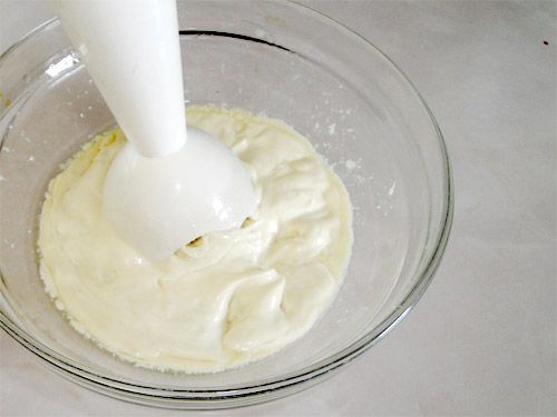 Опускаем насадку блендера в чашу, накрыв желток, начинаем взбивать.