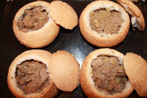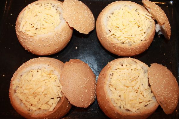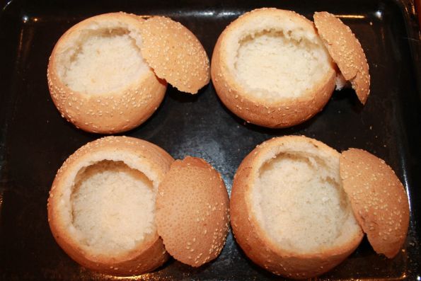 Срезаем у булочек шляпки и вынимаем мякоть. Чтоб получилась вот такая картина.