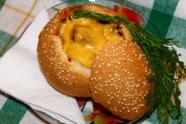В разогретую до 180 градусов духовку ставим наши горшочки минут на 20. За это время булочка успевает прогреться и пропитаться бульоном, а сыр расплавиться.