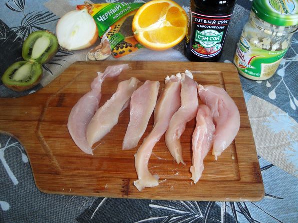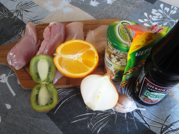 Сделаем куриные грудки в кисло-сладком соусе. Для этого нам понадобится 400 грамм куриного филе, половина луковицы, половина апельсина, киви, две столовые ложки соевого соуса, столовая ложка горчицы, два зубчика чеснока, щепотка чёрного молотого перца и щепотка соли.