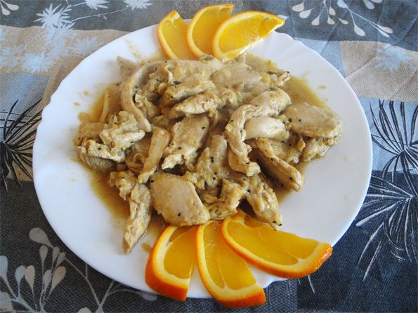 Всё содержимое сковородки выкладываем на блюдо, а оставшуюся половинку апельсина используем для украшения.