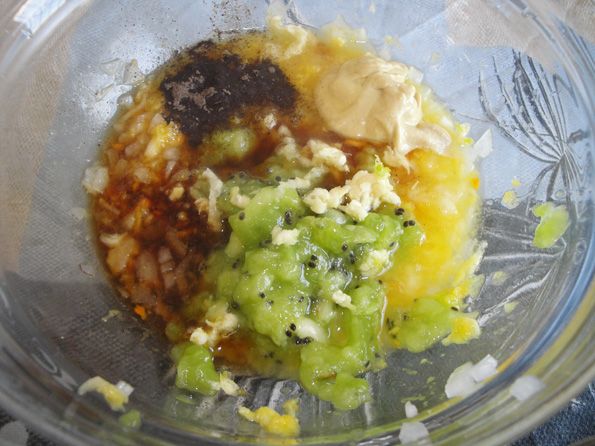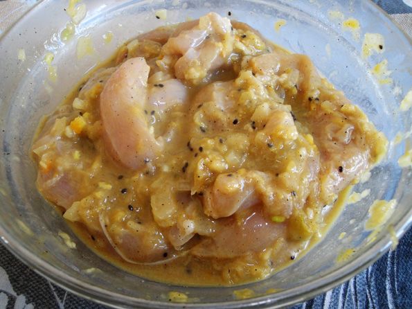 Перемешиваем с ломтиками курицы и даём настоятся около получаса.