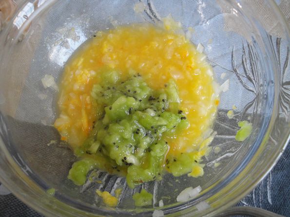 Измельчаем лук, натираем киви и половинку апельсина на тёрке.
